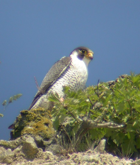 Beskrivelse: Hannen i vandrefalkeparret på Møns Klint i nærheden af reden hvor tre næsten flyvefærdige unger sidder.