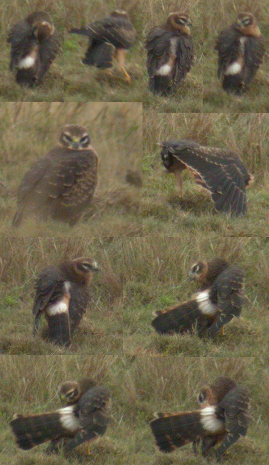 Denne spændende kærhøg er ikke helt let siddende. Jeg tror dog fortsat mest på Hedehøg, da halskraven trods alt ser ret diffus og mørk ud, hvor Steppehøg typisk har halskraven lysere, og mere komplet ned over struben. Den mørke plet på halssiden ser desuden ret lille ud. Der er således intet på billederne, der taler mod en "giftig" kombination af meget små hvide buer om øjnene og mørke halssidefelter. Den underste bue ser ret smal ud - hos de fleste Steppehøge med lys tegning under øjet (det har de altid) er buen lidt bredere bagtil, og ofte fremstår den som en bred lys plet bagtil på øredækfjerene. Dette er nok et af de tilfælde, hvor det ville have været fint med flugtfotos, så evt. brede sorte spidser på håndsvingfjerene kunne ses (hedehøg) eller mangel på samme (steppehøg). Jeg opfatter benet som ret kort, hvilket passer bedst med Hedehøg, men den er reelt svær.
