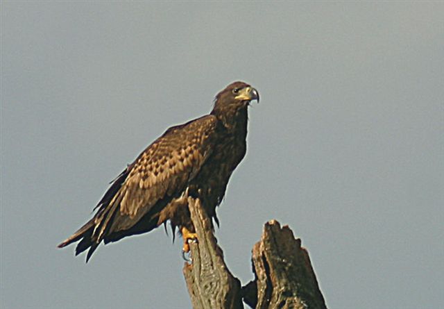 Juvenil (1k). Bemærk den ensartede dragt, der er typisk for helt unge fugle. Immature har altid flere generationer fjer af uensartet udseende. Karakteristisk for 1K er gulbrune, mørkplettede store dækfjer og "bukser" samt mørk næb mod lys tøjle (kan være let gul- eller blåtonet, men aldrig klart gul som hos ældre fugle)