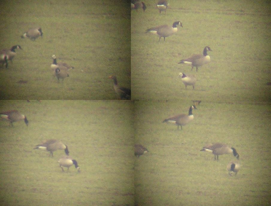 Beskrivelse: This aberrant Canada Goose was found amongst 400 normal Canadas and a few Greylags in fields 100 meters N of Holløse Bredning, northern Zealand by Andreas Hagerman. The bird’s proportions were identical to Canada Goose. The facial pattern resembled Barnacle Goose.