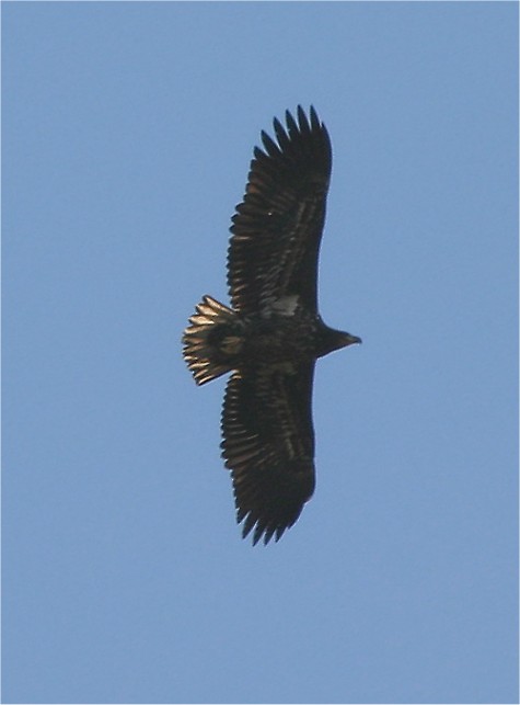 Bemærk gennemlysningen af halefjerene, der kan give indtryk af en lys hale - den viste haletegning er dog typisk for juvenil Havørn.