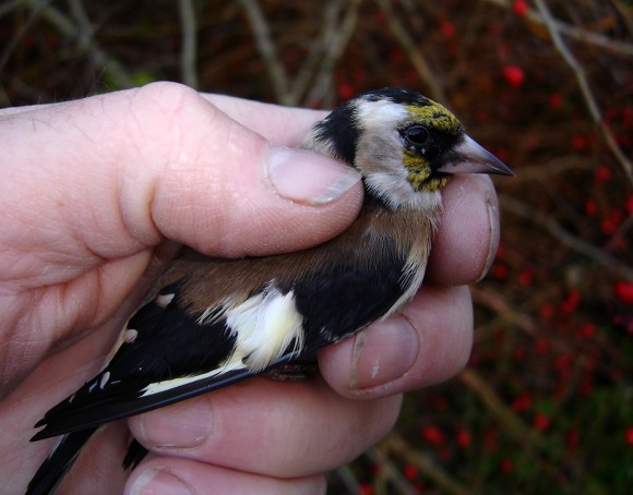 Beskrivelse: Jeg har i dag 13.11.2004 på Gedser Odde fanget og ringmærket en afvigende Stillits, som jeg hermed sender et par billeder af. Den blev fanget som den eneste Stillits sammen med en mængde Gråsiskener. Fuglen fraviger det normale ved, at de røde fjer i hovedet er erstattet af gule, og det gule vingebånd er meget lyst gullighvidt. Ellers normal udseende og størrelse som Stillits. Er den leucistisk, eller en hybrid? Mange hilsner, Hans Lind, Gedser Fuglestation.