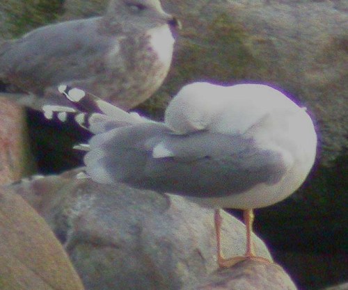 Close but no cigar! Fuglen er drilsk ved at være meget hvidhovedet og have gule ben. Mne desværre: helt hvid spids på yderste håndsvingfjer, stor hvid plet på næstyderste og begrænset set på ca. hsf 6 er for lidt sort til en Middelhavssølvmåge. Denn burde have meget mindre - om nogen - hvid plet på den næstyderste (den fjer, der plejes på billedet), normalt sort plet yderst i yderste håndsvingfjers hvide spids samt bredere sorte markeringer på de inderste synglie håndsvingfjer. Tror derfor på Sølvmåge af den gulbenede variant (ofte benævnt "omisssus"). Denne stammer overvejende fra østlige Østersø, hvor mågerne generelt har finere, mørke hovedtegninger end i Nordvesteuropa.