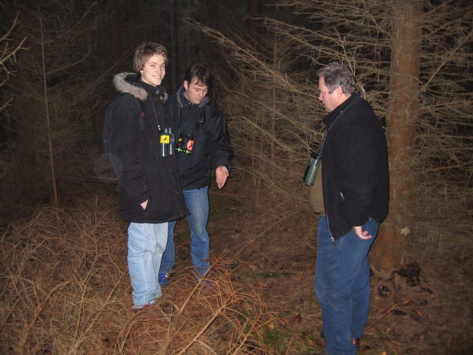 Beskrivelse: Rasmus Strack og Freddy S. Hansen diskuterer uglegylp fundet i løbet af dagen, mens Mathias fra Ungdomsafdelingen til fotografen.