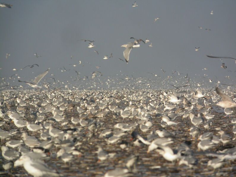 35.000 måger fouragerede, mens omkring 10.000 lå længere oppe på stranden og