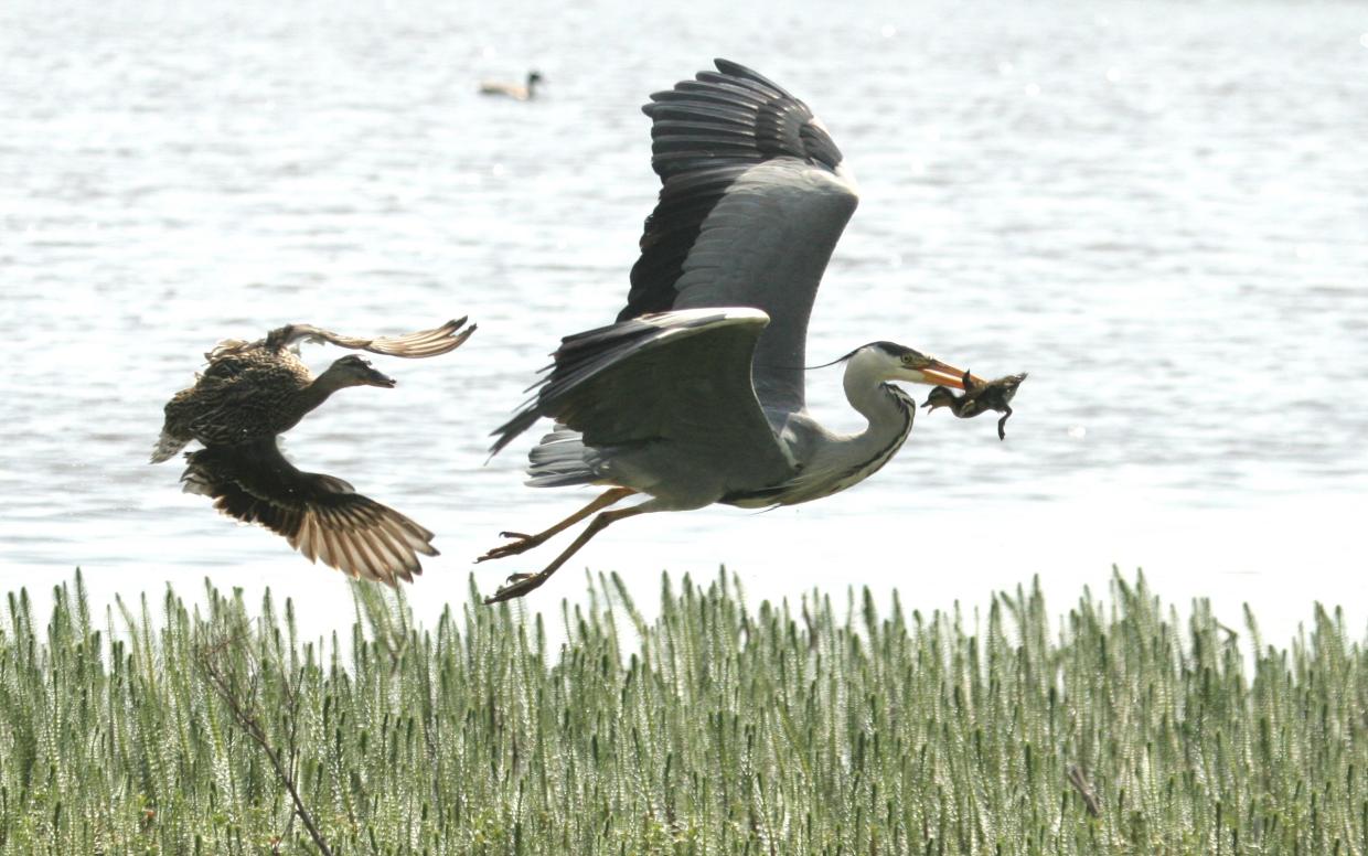 Fiskehejren spankulerede omkring men fik pludselig en vældig fart på og snuppede en gråandeælling lige for næsen af anden, som ikke kunne stille noget op imod den tyvagtige hejre. Den enes død, den andens brød...
