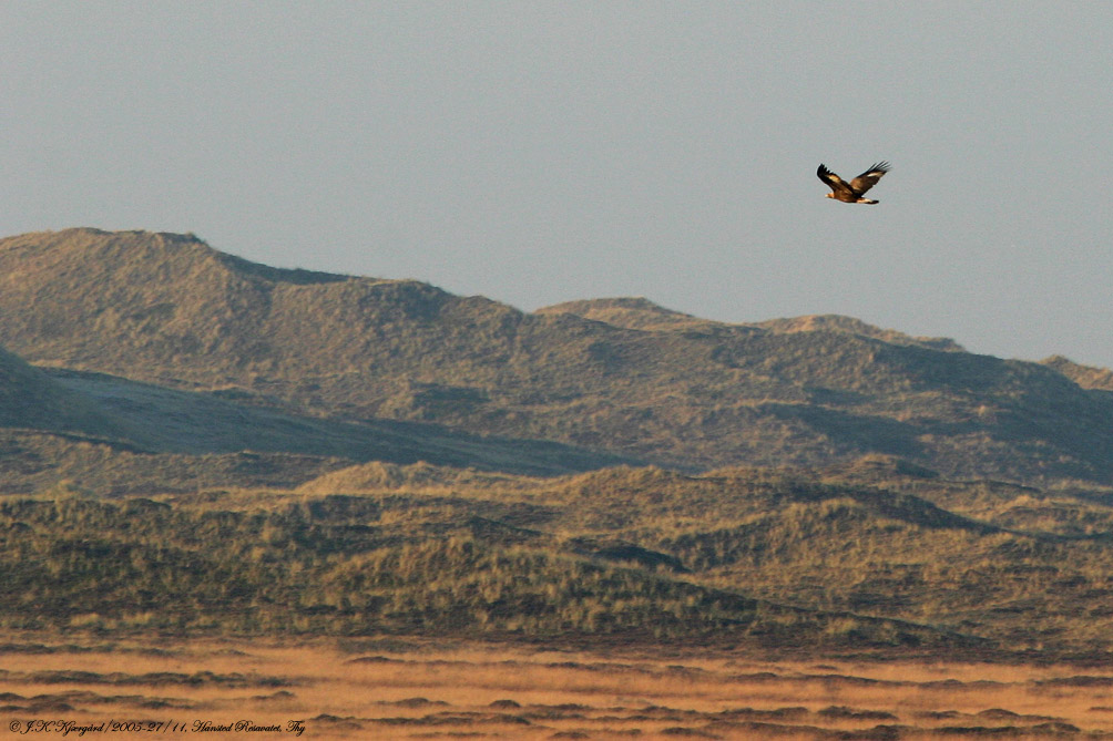 Men til alt det, der allerede er sagt vil jeg nævne komposition, farver og stemning. Helhedsindtrykket er det afgørende. Denne majestætiske ensomme fugl i et barsk og fascinerende landskab. Normalt er flugtbilleder af rovfugle set bagfra ikke særligt interessante. Men ørnen flyver hen imod noget. Den er på vej. Og den er flot paceres i den største klare flade af billedet og helt i overensstemmelse med de klassiske regler for ”det gyldne snit”. Farverne i landskabet harmonerer med ørnens farver. Det er med til at skabe ro i billedet. Samtidig giver det varme lys en vidunderlig efterårsstemning. Jeg behøver ikke at blive belært om, at det kan skabes gennem indstilling af WB på kameraet eller ved regulering af Kelvin værdien, hvis der fotograferes i RAW. Det afgørende er resultatet.