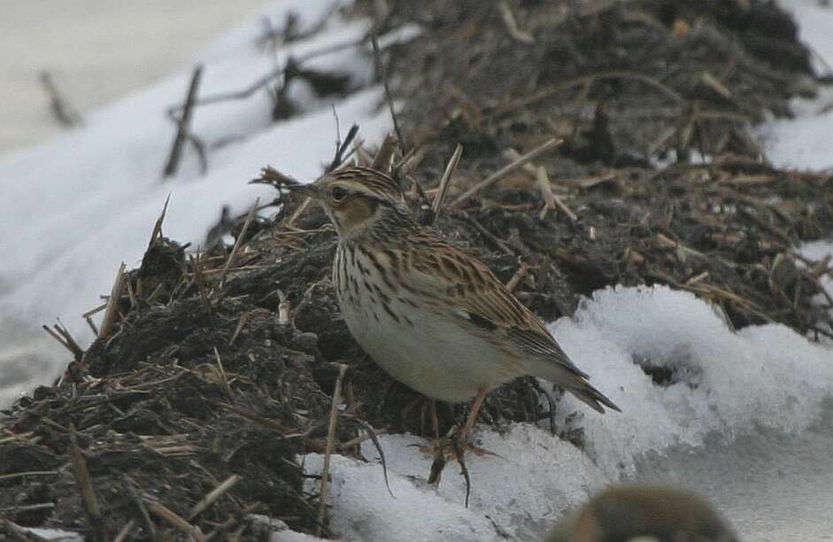 På Nordfugl er der et billede af Hedelærke i sne.