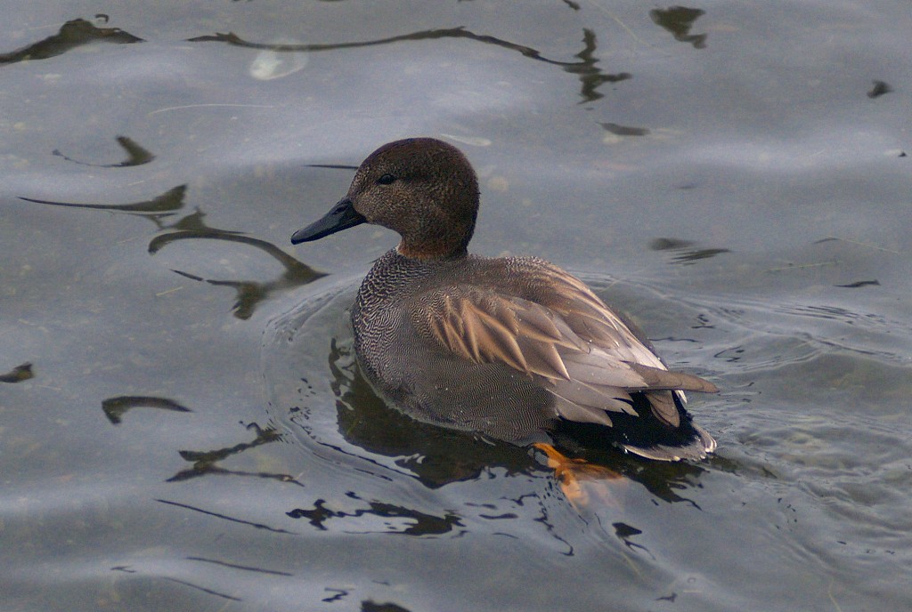 Det, der undrede os, var, at den i forhold til en knarand havde mørkt brunt hoved, kraftigt orange ben og intet hvidt vingebånd (i hvert fald aldrig synligt).