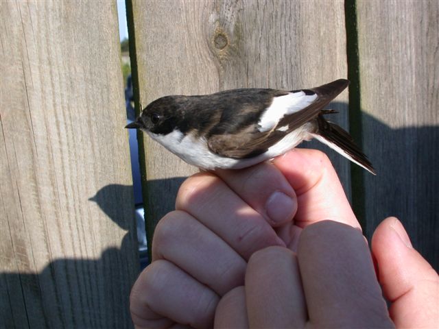 Beskrivelse: Vi fangede i dag en suspekt fluesnapper ved Blåvand. Uden tvivl en lidt afvigende Broget Fluesnapper, eller måske hybrid Broget Fluesnapper x Balkanfluesnapper. Det var Jens Hjerrild der pillede fuglen ud og kunne med det samme konstatere, at denne var lidt speciel med alt det hvide den havde i vingen. Det hvide nåede også helt ud på 4. hsf. Iflg Svensson er dette ret så sjældent på Broget Fluesnapper. Vi kiggede nærmere på fuglen og især på halen, der viste typiske tegninger for Balkanfluesnapper. Det hvide på yderfanen af yderste halefjer gik helt ned og rundede halespidsen, se fotos. Dette skulle indikere Balkanfluesnapper. Også underhalefjerene viste Balkanfluesnapperkendetegn. Vingelængden lå i overlapningszonen for begge arter. 2. hsf lå mellem 5/6, hvilket indikerer Broget Fluesnapper, kan dog sjældent ses hos Balkanfluesnapper. Og hvorfor skulle man lige fange en Balkanfluesnapper med den sjældneste vingeformel for arten. Mange hilsner Bent