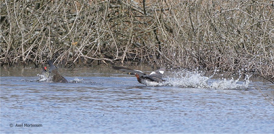 Beskrivelse: Hermed nogle billeder af grønbenede rørhøns i kamp - pludselig blander en gråstrubet lappedykker sig i opgøret, da de sandsynligvis er kommet for tæt på reden.