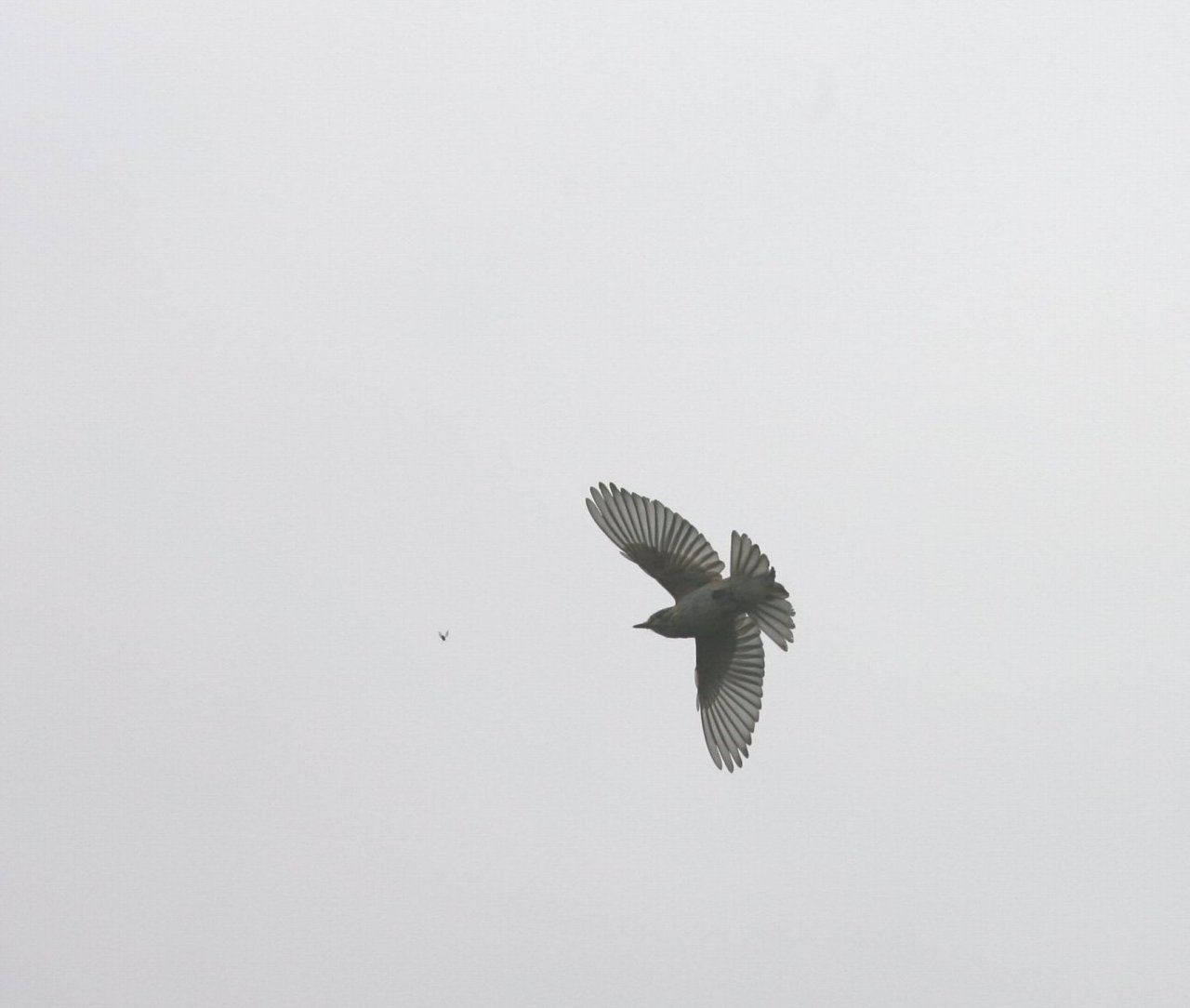 Beskrivelse: Så kan der tælles fjer! Fem unger fløjet af reden - de fodres rundt om i grantoppene. (Gråvejr, modlys)