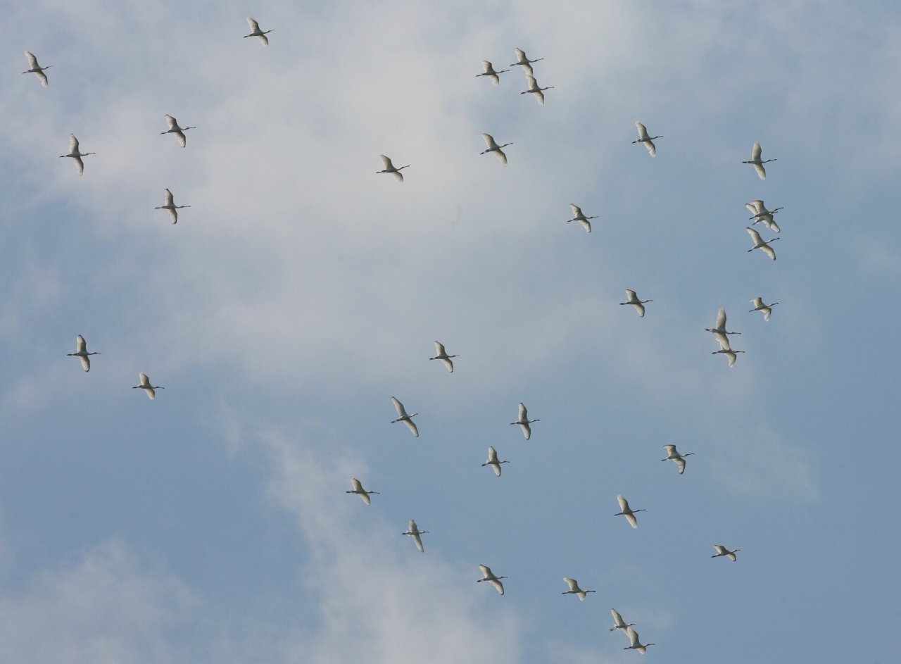 Beskrivelse: Her er 35 skestorke i luften samtidig - fuglene steg og steg op i skyerne. Til sidst var de bare prikker. Man kan tælle ungfugle ved at tjekke de sorte vingespidser.