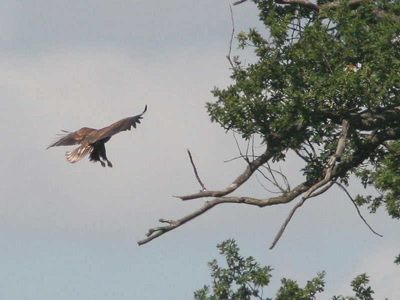 Beskrivelse: Netop udfløjet unge af Havørn. Denne helt friske fugl har rødbrunt anstrøg på oversiden - mere end man normalt ser om vinteren. Én af 3 af årets unger ved lokaliteten.