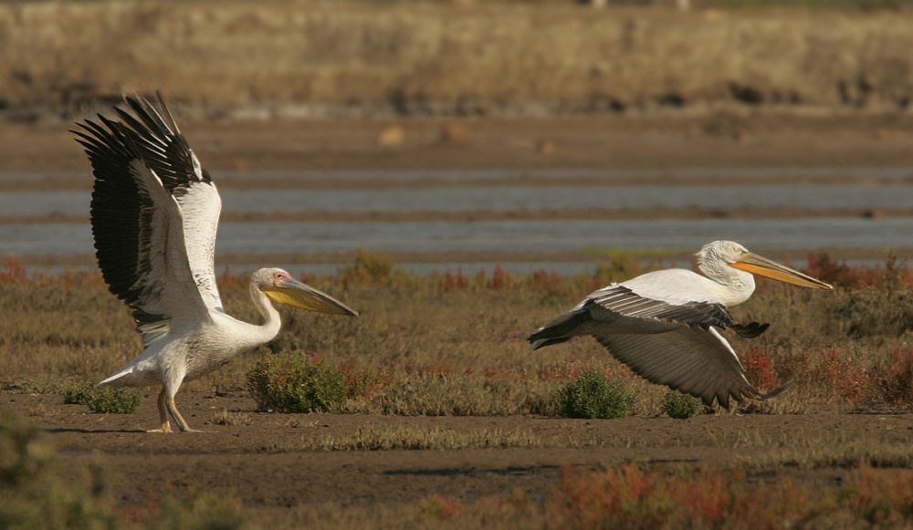 Titel: Adulte i vinterdragt med Almindelig Pelikan til venstre
