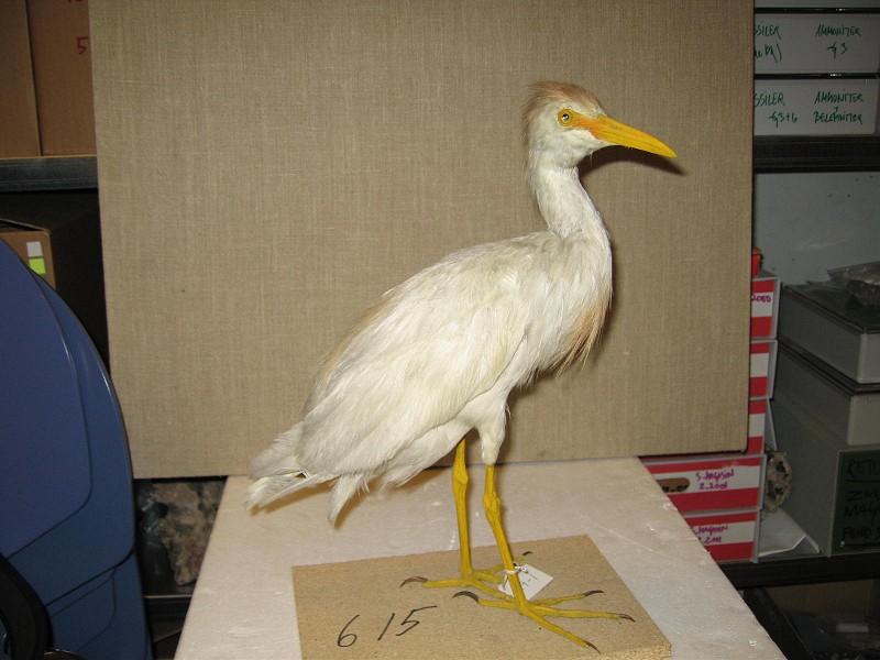 Beskrivelse: Udstoppet kohejre på Svendborg Zoologiske Museum.