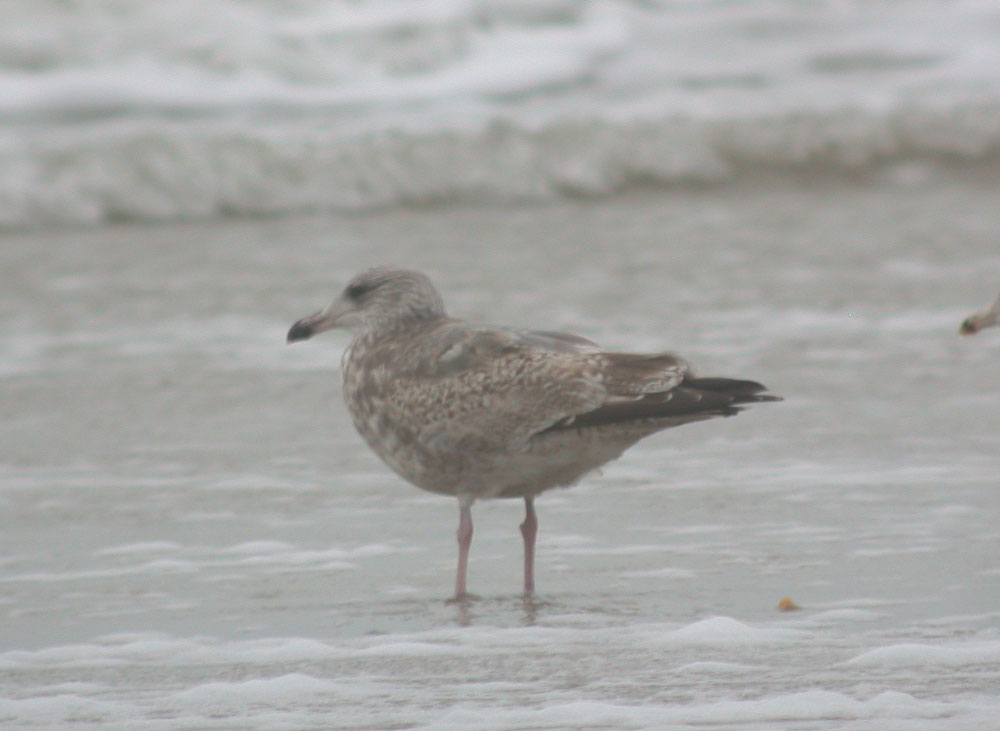 Beskrivelse: Denne måge gav mig associationer til en smithsonianus i anden vinterdragt, pga. kombinationen af sværtet underside, tofarvet næb, mørke tertiærer og ikke mindst helt sort hale – hele vejen ind. Desuden kunne jeg efterfølgende læse i ”Gulls” at kombinationen kridthvide axillarer mod mørke undervingedækfjer – præcis som denne – er typisk for smithsonianus, og en karakter som ikke ses hos Sølvmåge. Håber på kommentarer.