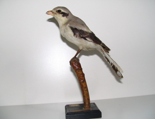 Etiketten på træpladen indikerer, at det er mange år siden, at fuglen blev udstoppet. Teksten er så utydelig, at den ikke umiddelbart kan tydes, intet årstal. Der har været skrevet noget med blyant under pladen, men det meste er slidt bort. Selve mærkaten med dato, årstal, findested og art sidder på oversiden af pladen og er også ret slidt, håndskreven m.sort pen. Med lup synes jeg at kunne læse: 11/9 ? - 75 (hvilket må være 1875) + La-ius --cubitor . Nederst på mærkaten: et navn, som er ulæseligt + Fredericia (= en konservator i Fredericia?)