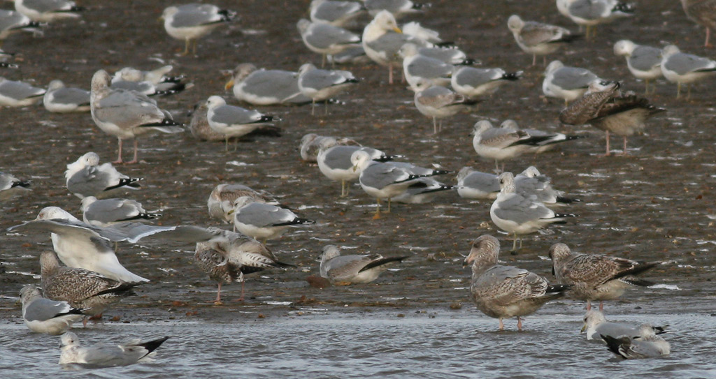 På dette billede står der en eur.sølvmåge i samme alder i venstre hjørne. Den ligner meget godt de fleste sølvmåger på dette tidspunkt, med meget lyse tertialer og store dækfjer, meget hvid krop og stort set med hvid over og undergump. Mængden af sort på halen i 3w varierer meget fra pletter til mere udbredt halebånd, mens det ikke er svært at finde 2w europæiske sølvmøger, der har stort set sort hale. Men man kan sagtens finde fugle, der er knap så langt i fældningen, og det store spørgsmål er, om de endog kan komme til at ligne fuglen fra Fjaltring til højre. På dette billede får man også et indtryk af fuglens gråmågeagtigte fremtræden, dens ret mørke tertialer i forhold til alderen. Jeg vurderede rygfarven lidt lysere end sølvmåge i felten, men det kan også være en effekt af den mørke indramning.