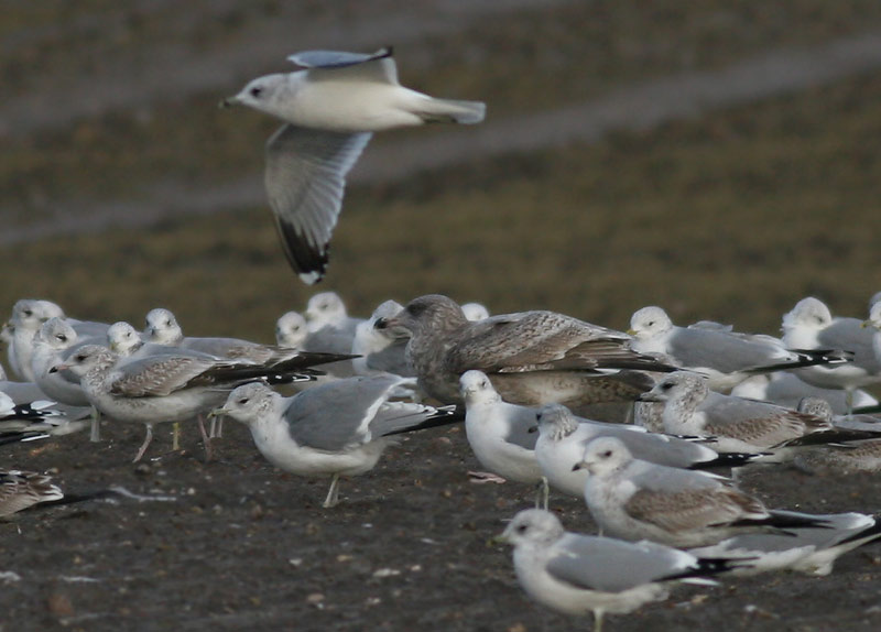 Denne fugl er ikke let bestemmelig, da den ikke udviser, hvad man vil kalde typiske tertialer og store dækfjer. Denne fugls tertialer og store dækfjer kan sidde på både vores sølvmåge og amerikansk, derfor kan de ikke bruges til at bevise, at det er hverken det ene eller andet. Men på billedet her, kan man se en af grundene til, at jeg tror det kan være en amr, da jeg tager den gumptegning som udtryk for, at den har været meget kraftig tegnet på underhaledækfjerene, faktisk er de mørke bånd bredere end de hvide, hvilket har været nævnt som en god karakter.