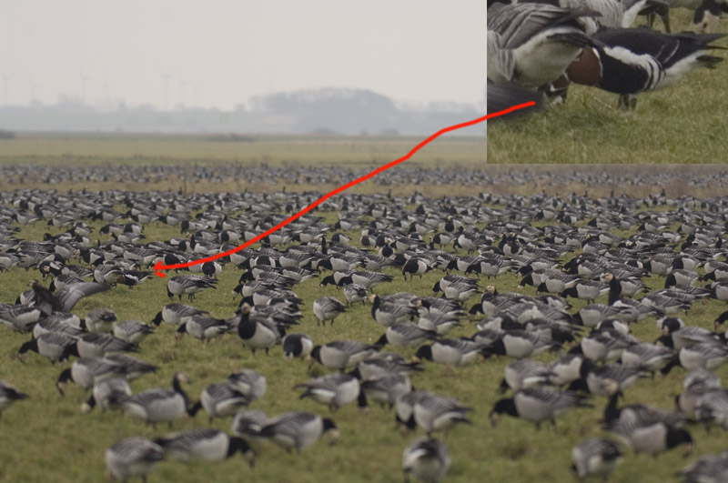 Beskrivelse: Holdt i vejsiden og spiste frokost i fredags ved siden af en stor flok Bramgæs, tog et par billeder af de nærmeste, tog endnu et par ud over flokken, kørte videre - senere på dagen modtog jeg en DOF-call om Rødhalset Gås ved Ballum Enge, det var netop hvor jeg havde holdt, mon den var på et af billederne. Det var den, havde jeg nu set den - for jeg kiggede igennem søgeren, da billedet blev taget, kan den ”krydses” ? Har heldigvis set den tidligere, så det behøver jeg ikke at tage stilling til – hvad mener du ? Tag sagen med et smil, venlig hilsen Carsten
