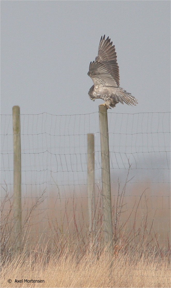 Beskrivelse: Jagtfalken sad på sin pæl i flere timer til stor fornøjelse for de mange ornitologer.