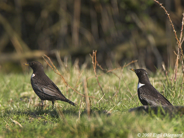 Tror det er to hanner, men af hver sin alder. Den mere hunlignende ser ud til at lave en fældningsgrænse på de store dækfjer, hvor den meget kontrastrige fugl har helt ensartede store dækfjer.