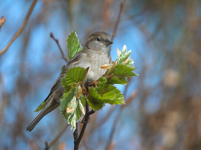 Beskrivelse: Gråspurv fouragerer på jomfruelige bøgeblade