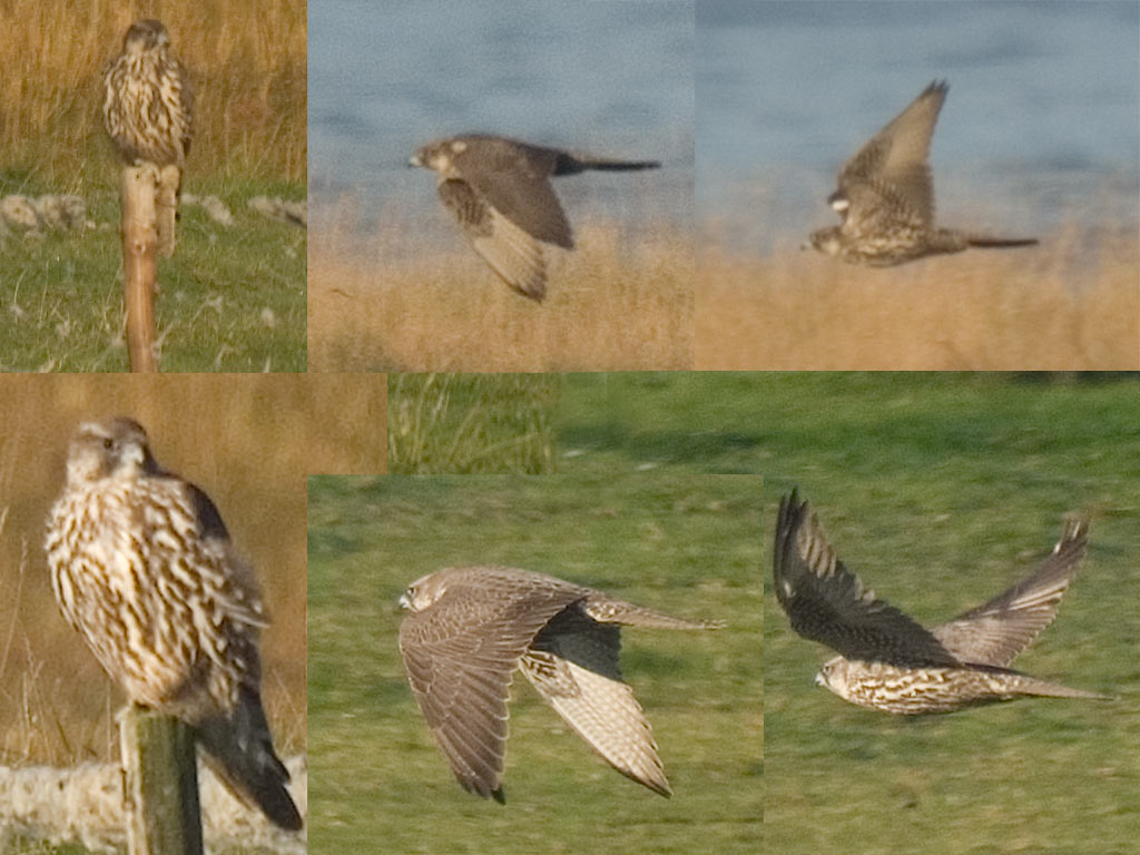 Beskrivelse: Øverste tre fotos Jagtfalk, kendetegn hvid plet på højre vinge, meget stor fugl. Nederste tre fotos Vandrefalk, Caledus.