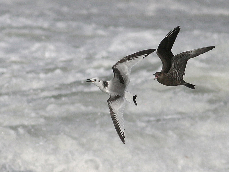 Næbbet er svært at bedømme, da fuglen åbner det, men tæt på sås at halvdelen af næbbet var sort, kun basis lys. Almindelig Kjove har smallere næb, der er lyst med sort spids, ikke ulig ung Gråmåge.