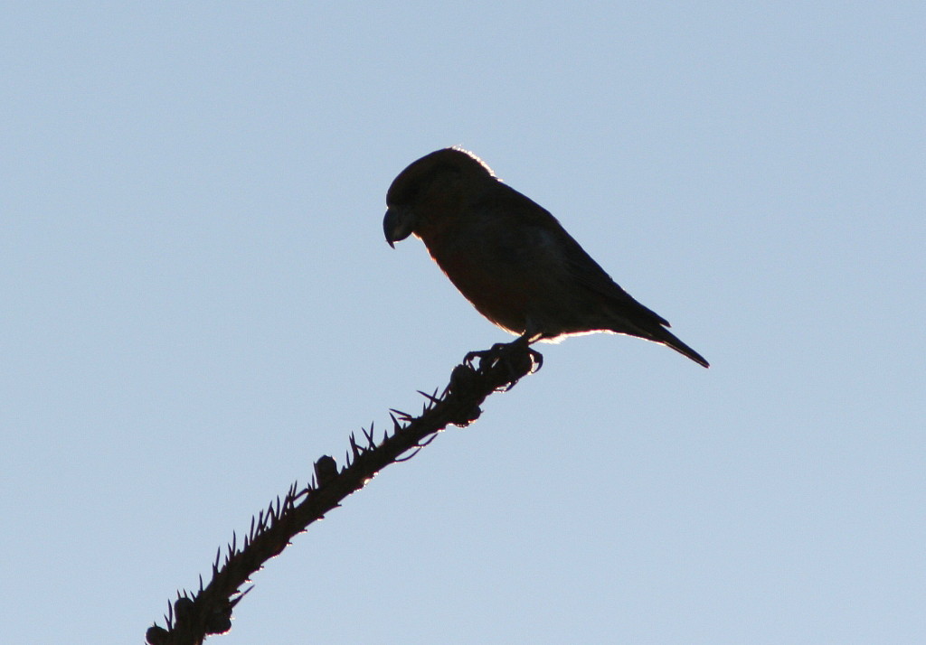 Beskrivelse: Et forsøg på at fremhæve Stor Korsnæbs jizz ved et silhuet foto. Bemærk stort hoved og kraftigt papegøjeagtigt næb. Så karakteristiske fulge som denne kan ingen være i tvivl om.