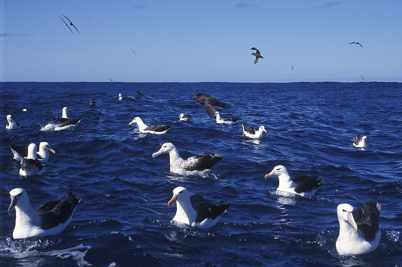 Beskrivelse: Vandrealbatros (sandsynligvis ssp Gibsoni), fuglen i midten. På billedet ses også mellem- (”shy”) albatros (ssp cauta) i nederste venstre og nederste højre hjørne, sortbrynet albatros (ssp melanophrys foran og til højre for vandrealbatrossen, og ssp impavida (”Campbell albatross”) langt til venstre) og Great-winged petrel (Pterodroma macroptera, de nærmeste flyvende fugle). Nogle af de samme arter ses også længere i baggrunden.