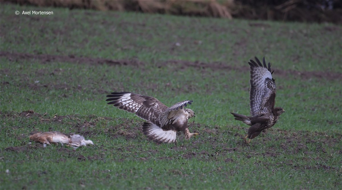 Beskrivelse: Musvågen fandt den døde hare, men en fjeldvåge fik også øje på haren. Så der er ingen pardon - væk med dig.