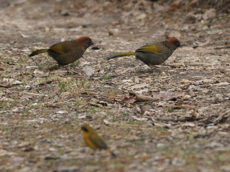 Beskrivelse: Laughing-thrushes er en herlig gruppe af fugle. Enhver der værdsætter dem vil nyde et besøg på bjerget Pulchowki nær Kathmandu i Nepal, hvor mængder af arter ses, ofte side om side, eller - som her - i samme kikkertfelt som andre syd-asiatiske glansbilledfugle. Her med blåstjerte-slægtningen Golden Bush Robin (Tarsiger chrysaeus) i forgrunden.