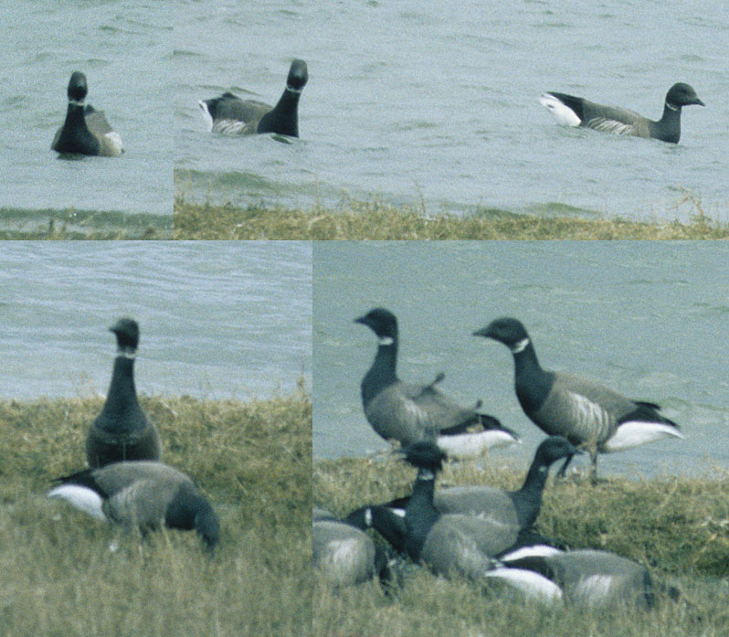 Beskrivelse: Denne Knortegås fotograferede jeg for flere år siden. Den viste mange karakterer som Sortbuget men jeg var alligevel i tvivl. På collagens 4 billeder ses på de 2 øverste og det nederste til venstre halsen forfra med den ubrudte hvide ring. På billedet nederst til højre står fuglen bagerst til højre.