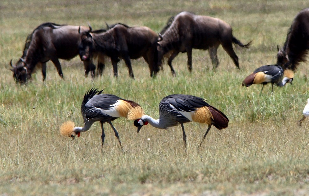 Beskrivelse: Krontraner med gnuer i baggrunden.