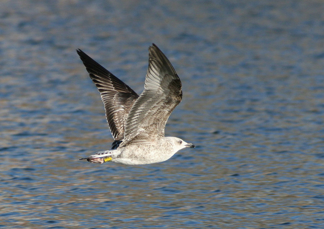 Fin flyktbild av middelhavssølvmåge! Notera att de inre handpennorna (inre håndsvingfjær) är mörkare än hos en 2K gråtrut samt att vingundersidorna är ljusare än hos en genomsnittlig gråtrut (mer åt mörk cachinnans).