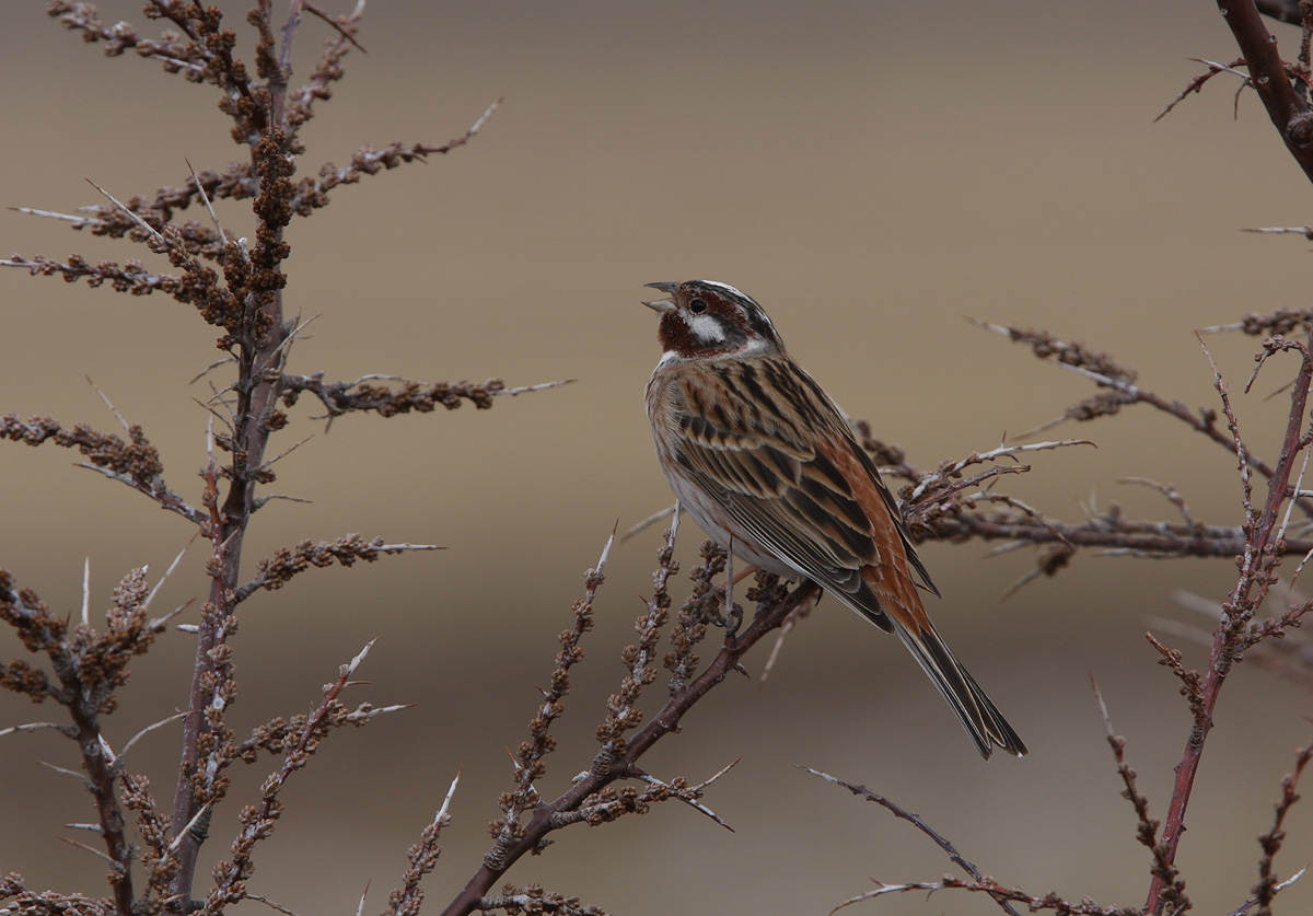 Beskrivelse: En attraktiv værling på yngleplads i det østlige Kirgisien. Formentlig relativ nyligt ankommet til ynglepladsen - endnu reltaivt få fugle inden for en strækning der normalt rummer 8 par; denne dag blot tre syngende hanner samt en enkelt hun. Sang og kald ligger tæt op ad Gulspurven, og de to arter ses ofte i blandede vinterflokke. Uvished om forekomsten af hybrider, men med de to arters ligheder, er det formodet at der i overlapzonen mellem de to arter forekommer en del hybrider. I de blandede vinterflokke jeg har gennemkigget, er jeg endnu ikke stødt på hybrider - men det er for tidligt sige noget om hvor almindeligt eller ej dette fænomen forekommer.