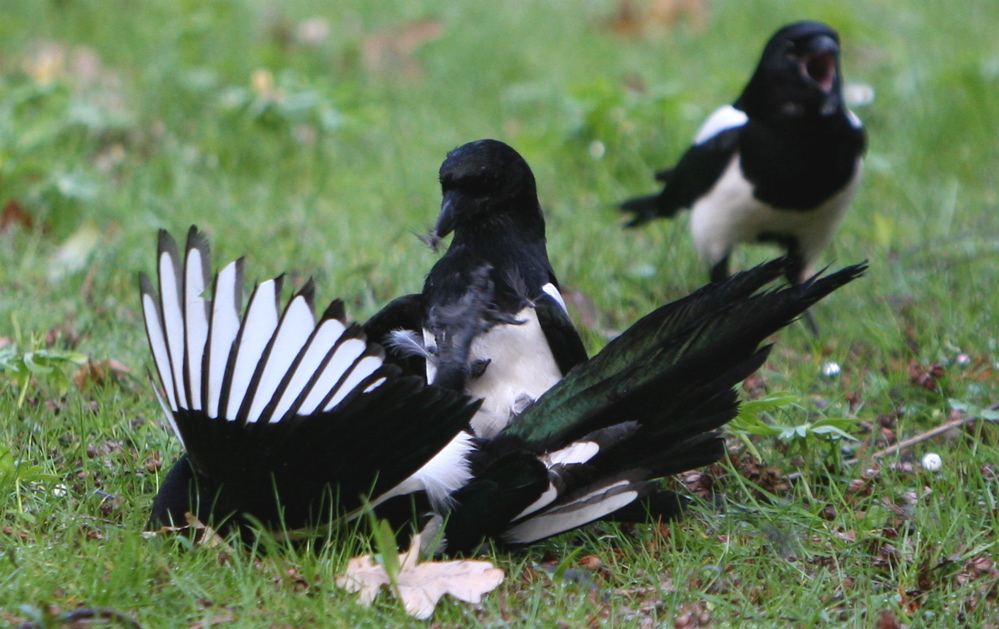 På vej hjem fra arbejde ser jeg et flok Husskader slås på (villa-)vejen. Jeg tror de slås om noget foder af en slags, men opdager så at alle sammen hakker løs og hopper på en bestemt Husskade. Den fik virkeligt tæv af de andre. Simpelthen en form for kollektiv afstraffelse. Det lykkedes den at komme fri og flyve væk med en 2-3 stk. efter sig, mens resten sad lidt "og snakkede sammen" før end de fløj hver til sit.