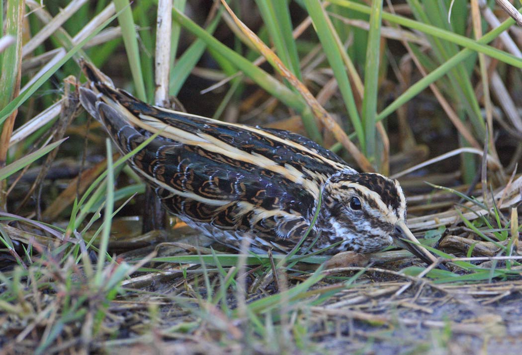 Beskrivelse: En bekkasin stod diskret i skyggen ved en græstue. Jeg fik en mistanke om, at det måske var en enkeltbekkasin. Jeg besluttede at iføre mig gummistøvler og vade tættere på for evt. at få nærbillede af den eller i hvert fald se, om den lettede på afstand og dermed var en dobbeltbekkasin.