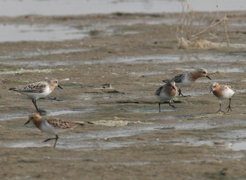 Beskrivelse: Variationen i den røde forhals´s udbredelse ses her på en lille flok Rødhalset ryle i sommerdragt. De fleste er murstensrøde på forhalsen, og virker set forfra påfaldende mørke med hvidt felt omkring næbbet. Selv de mest orangebrun-farvede Dværgryler har aldrig så rustrød farve, ligesom den varme farve er tydeligst på halssiderne. Men også andre karakterer er afgørende: kun få rødhalsede ryler har nogen antydning af Dværgrylens tydelige hvide V på ryggen ligesom grundfarven virker mere grålig fremfor dværgrylens varmt brunfarvede helhedsindtryk oventil. Mange Rødhalsede ryler har et grån anstrøg i nakken, der har tendens til yderligere at isolere og forstærke forhalsens røde felt.