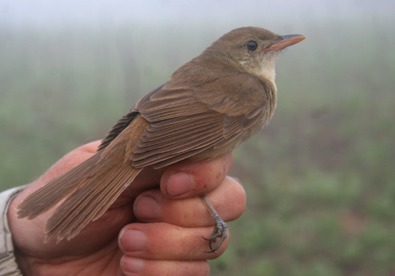 Beskrivelse: Tyknæbbet Sanger er næsten så stor som Drosselrørsanger, men dens form og adfærd er helt anderledes. Under trækket ses den således i krat og buskadser, hvor dens brede krop, lange halg, korte vinger og store, runde hoved med stirrende sort peberkornsøje giver den en vis lighed med en mindre larmdrossel. Bemærk også det korte næb, der bl.a. kan minde om Schwarz Løvsangers.