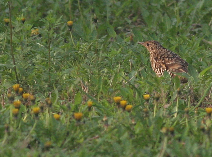 Beskrivelse: Gulddrossel ses sjældent sååbent som her,men foretrækker at hoppe rundt skovbunden og "gemme sig" ved at stivne mellem løv- hvor den er perfekt camoufleret. Undertiden flyver den til et træ, hvor den typisk sætter sig tæt på stammen i træets øverste del, og sidder helt stille; formentligt tror den sig da uset. Såesktremt skulkende som man ofte antager er den sjældent - mere eftertragtet og derfor "jaget vildt" på trækstederne.