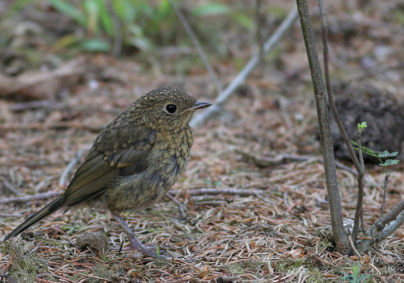 Som mange andre smådrosler har Rødhals en plettet juvenil dragt, som illustreres her. Man ser også de fleste nys udfløjne småfugle lyse, fortykkede mundvig.