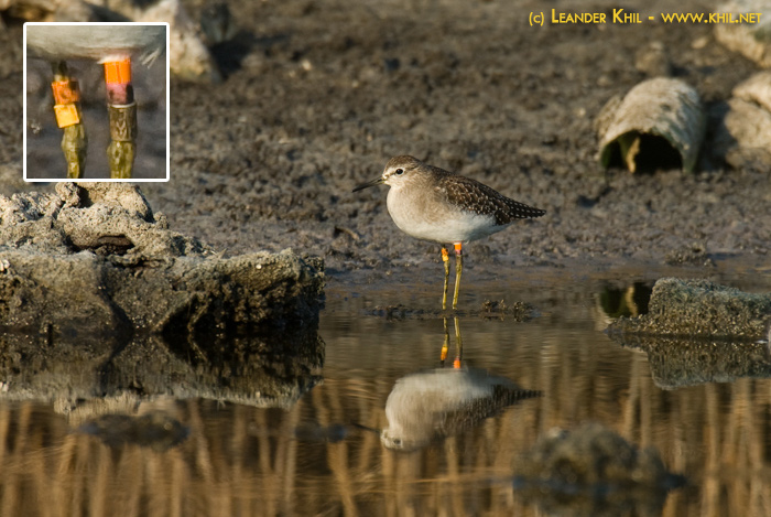 After reading Kent's info of this project I made a second revue of this picture and I must admit that it can be interpreted different with this information in mind as the "damaged" looking of the leg could probably be a moistured pink plastic ring, but my imagination was not big enough to consider somebody to place 5 (five) rings to a minor bird no matter with which intention this was made.