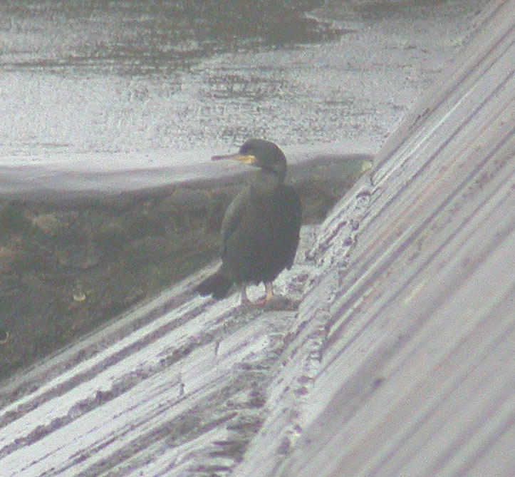 Billedet er taget i skygge, så det er ikke det skarpeste, men topskarven har grønt øje, lys strube og meget gule ben, som indikerer en yngre fugl.