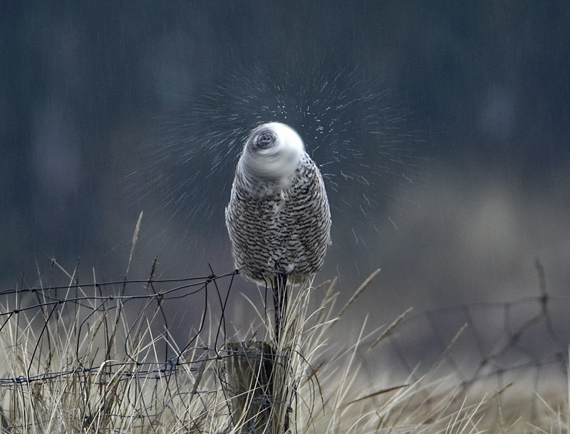 Beskrivelse: Sneuglen sad i regn og blæst, så vandet skulle rystes af en gang imellem, pga. halvmørket og deraf kort lukketid gav det et lidt anderledes billed.
