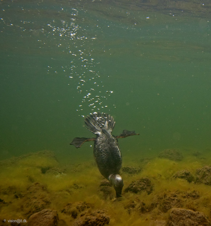 Beskrivelse: Læg mærke til hvordan den kan dreje svømmefoden næsten 180 grader, så den kan modvirke opdriften. På den måde kan den fouragerer i normal horisontal stilling.