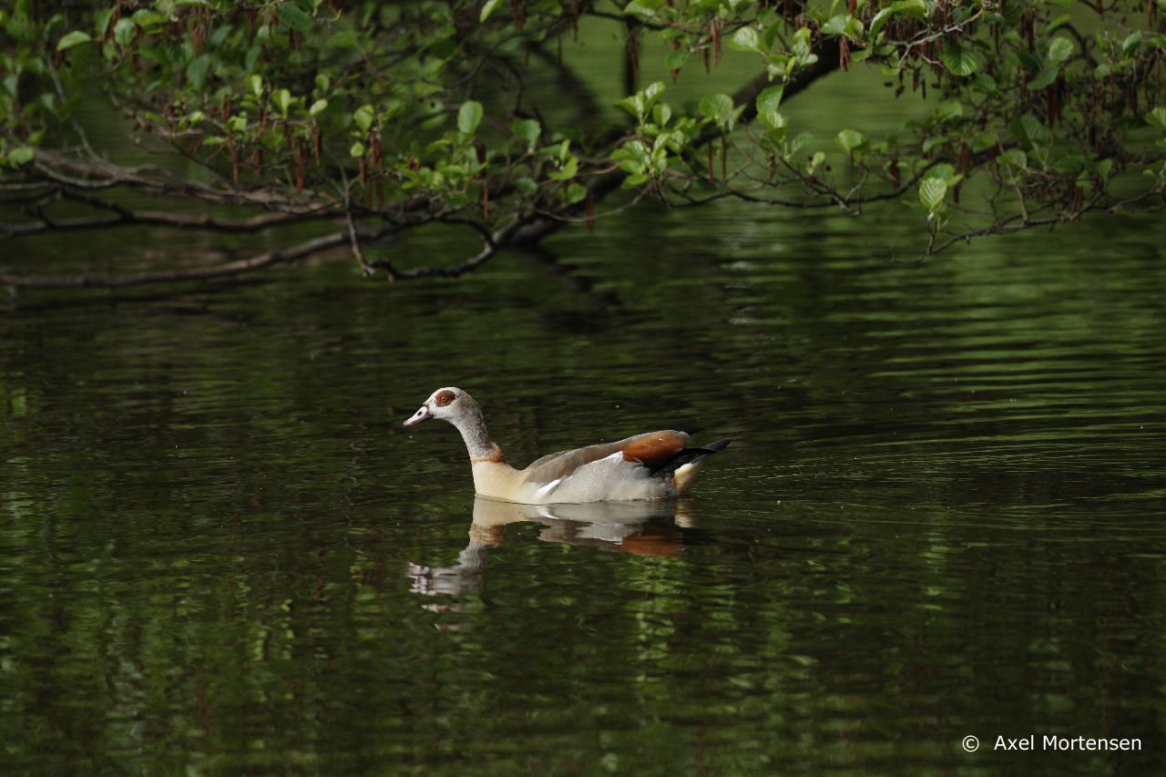 Beskrivelse: Tidlig morgen ville jeg se, om gårsdagens knarand stadig var i skovsøen - til min forbløffelse var der også en nilgås i søen ! Desværre blev den skræmt, da jeg pludseligt dukkede op.