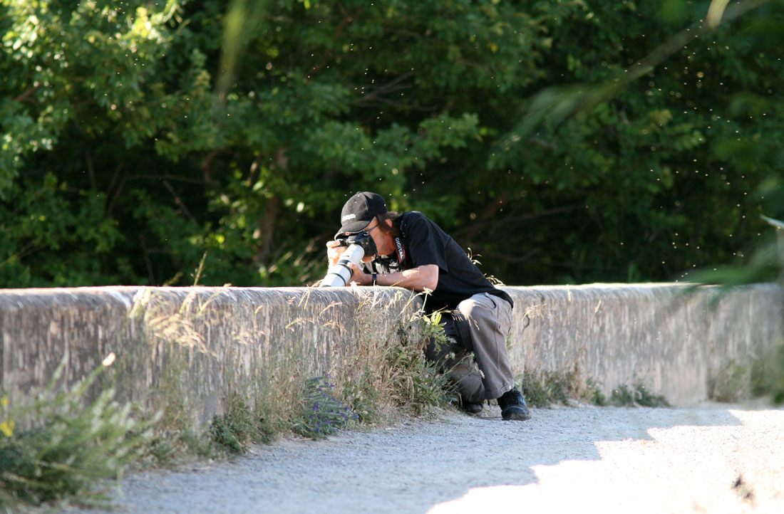Beskrivelse: Mens Bent Thøgersen konsentreret fotograferer Kamblishøne med unger, sværmer horder af myg over hans hoved.